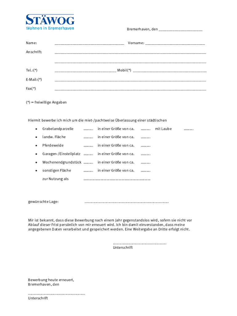 ___Tel.:(*)___ Mobil(*) ___Email:(*)___Fax(*)___(*) freiwillige AngabenHiermit Beebe ICH mic hum die main/pachtweise berlassung anger stdtischen
