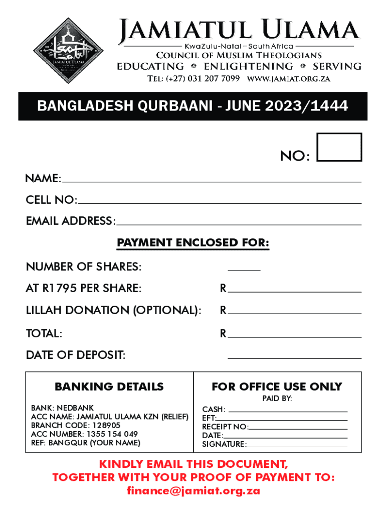 BANGLADESH URBAN JUNE 2023/1444 NO: NAME: CELL NO: EMAIL ADDRESS: PAYMENT ENCLOSED FOR: NUMBER OF SHARES: AT R1795 PER SHARE:RAILWAY DONATION (OPTIONAL):TOTAL:DATE OF DEPOSIT: BANKING DETAILS OFFICE