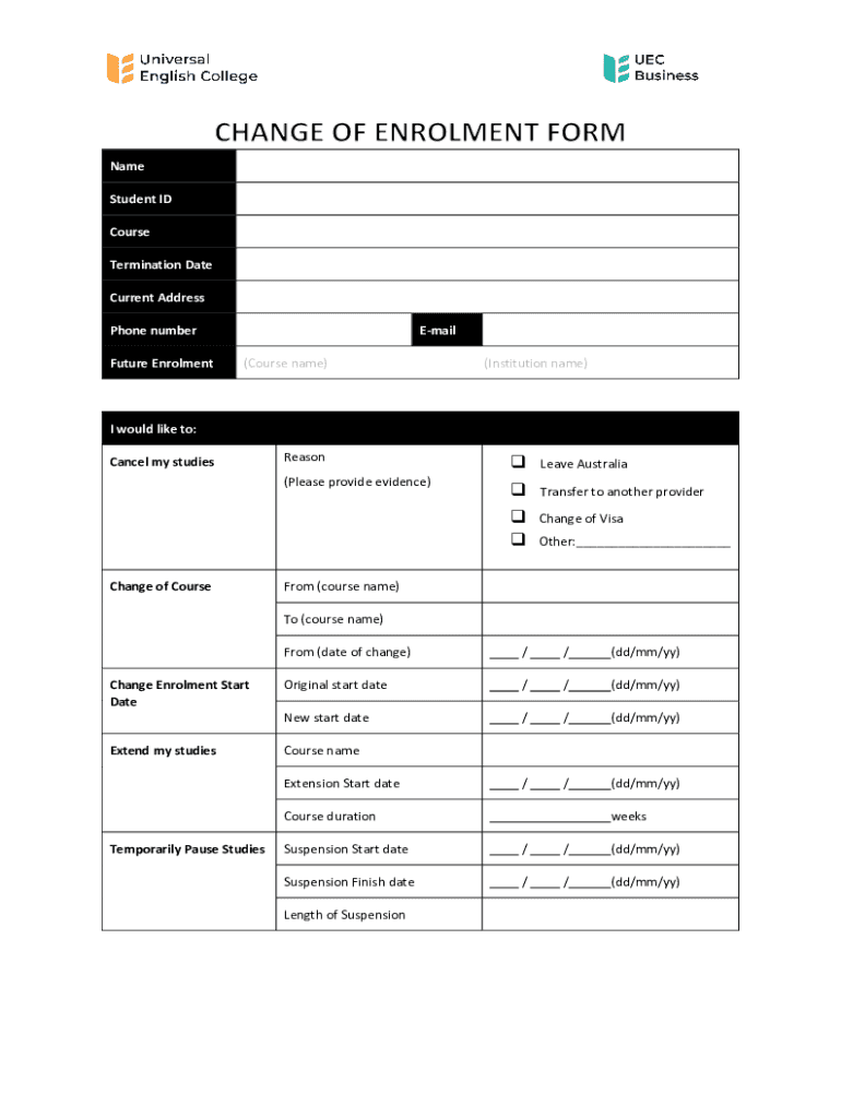 Name Student ID Course Termination Date Current Address Phone number Future EnrolmentEmail (Course name)(Institution name)I would like to: Cancel my studiesReason (Please provide evidence)Change of