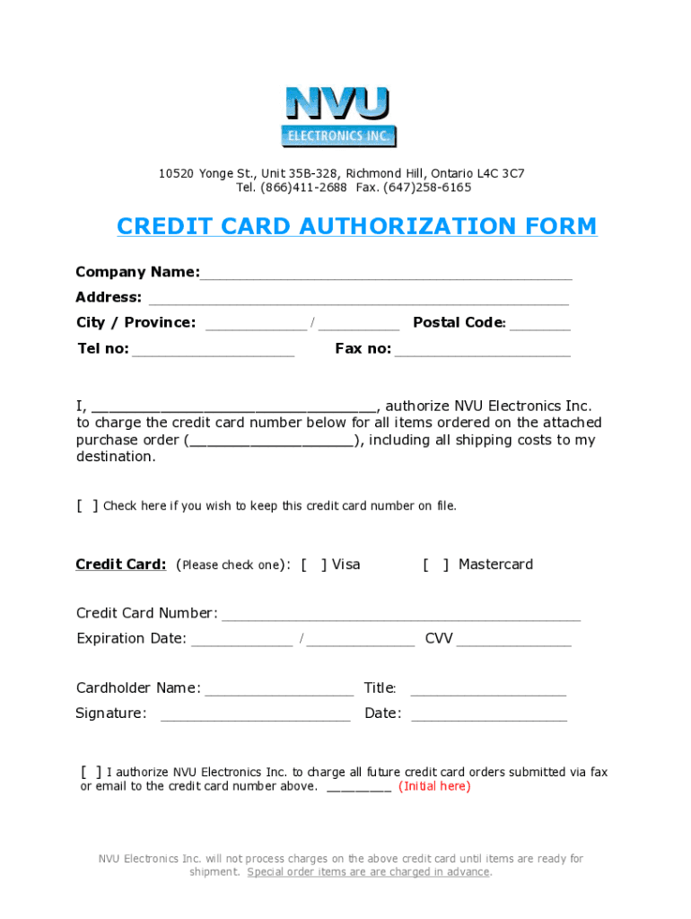 10520 Yong St., Unit 35B328, Richmond Hill, Ontario L4C 3C7 Tel. (866)4112688 Fax. (647)2586165CREDIT CARD AUTHORIZATION FORM Company Name:___ Address: ___ City / Province: ___ / ___ Tel no: ___Postal
