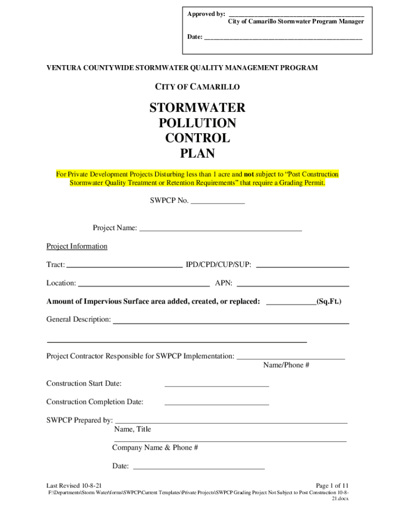 Approved by: ___ City of Camarillo Stormwater Program Manager Date: ___VENTURA COUNTYWIDE STORMWATER QUALITY MANAGEMENT PROGRAMMING OF CAMARILLOSTORMWATER POLLUTION CONTROL PLAN For Private Development