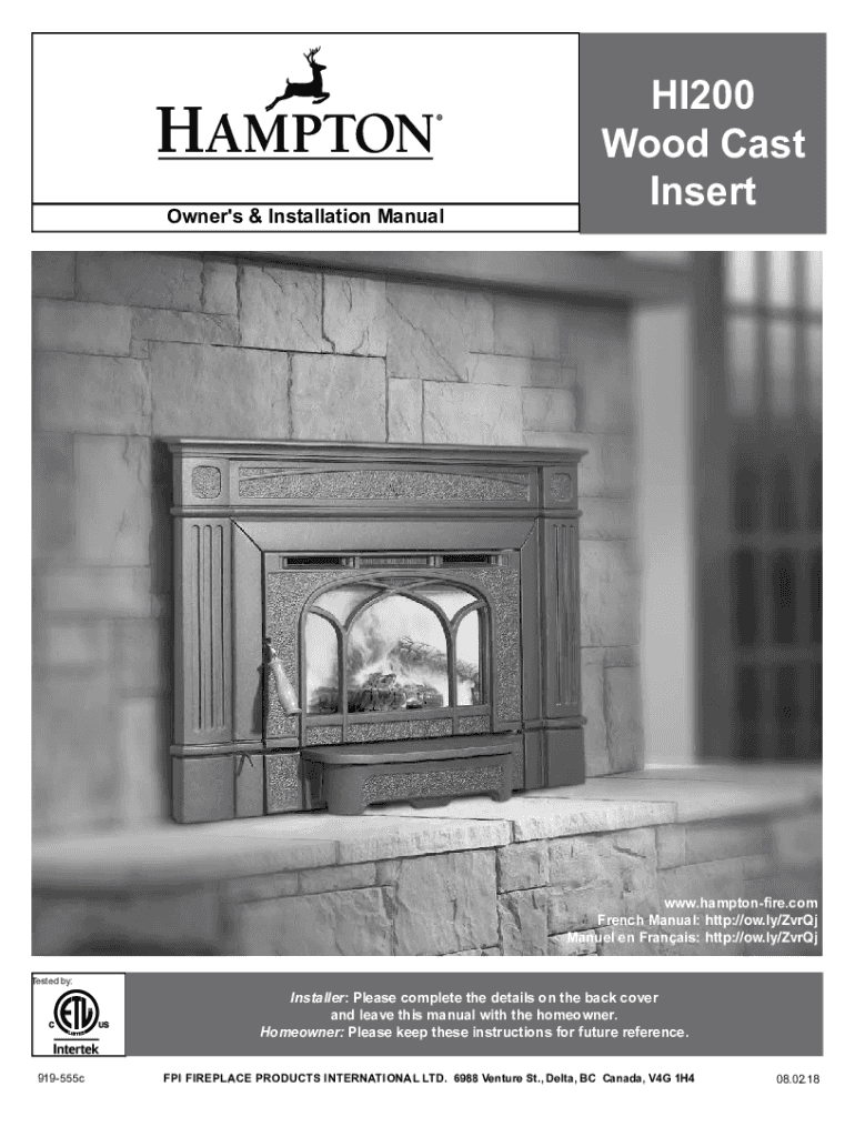 Owner\'s & Installation ManualHI200 Wood Cast Inserted.hamptonfire.com French Manual: http://ow.ly/ZvrQj Manuel en Francis: http://ow.ly/ZvrQj Tested by:919555cInstaller: Please complete the details