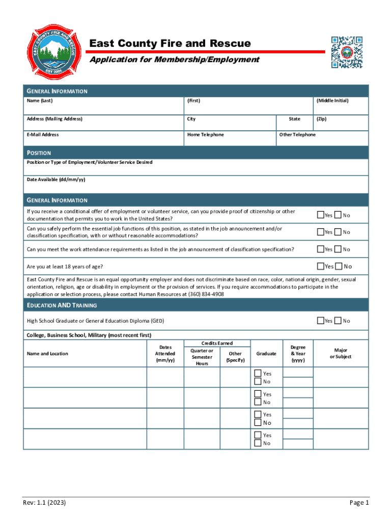 East County Fire and Rescue Application for Membership/EmploymentGENERAL INFORMATION Name (Last)(First)Address (Mailing Address)CityEMail Addressable Telephone(Middle Initial) State(Zip)Other TelephonePOSITION