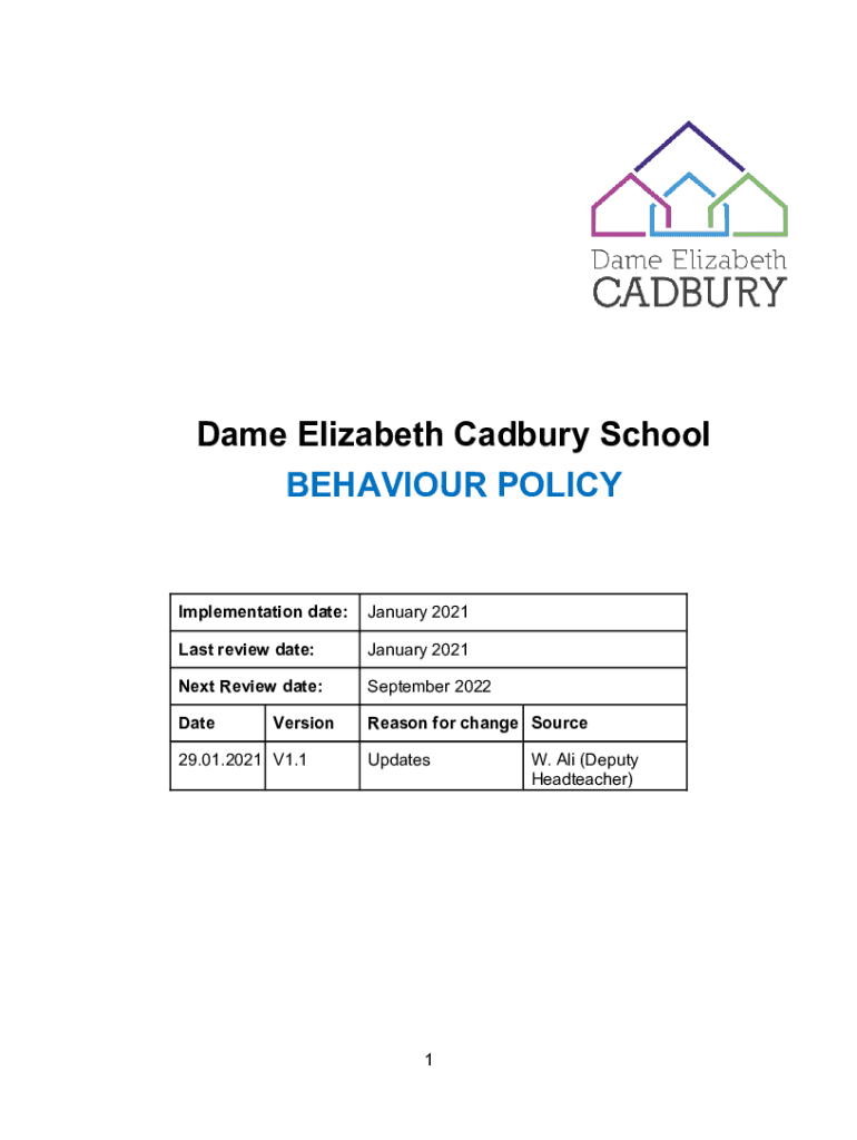 Dame Elizabeth Cadbury School Behavior POLICYImplementation date:January 2021Last review date:January 2021Next Review date:September 2022DateReason for change SourceVersion29.01.2021 V1.1Updates1W.