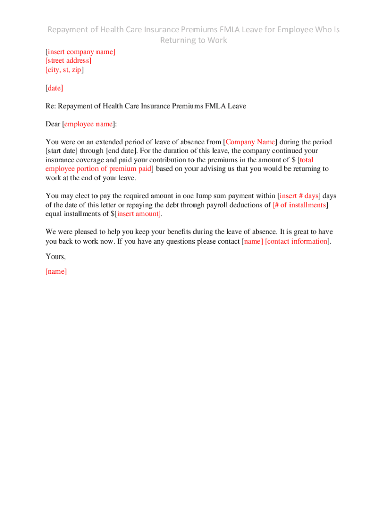 Repayment of Health Care Insurance Premiums FMLA Leaves for Employee Who Is Returning to Work [insert company name] [street address] [city, st, zip] [date] Re: Repayment of Health Care Insurance Premiums