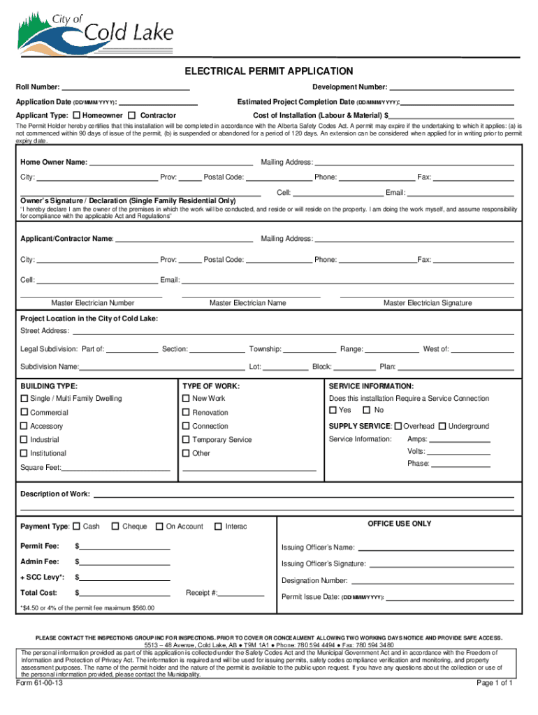 ELECTRICAL PERMIT APPLICATION Roll Number:Development Number:Application Date (DD/MMM/YYY): Applicant Type:Estimated Project Completion Date (DD/MMM/YYY):HomeownerContractorCost of Installation (Labor