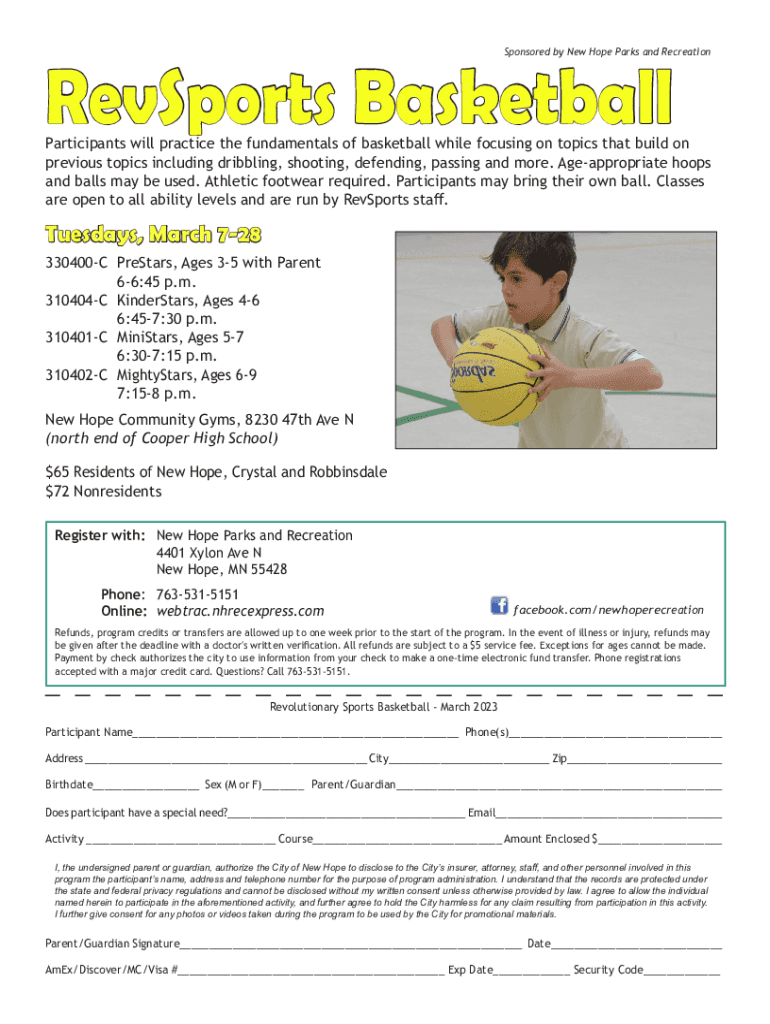 Sponsored by New Hope Parks and RecreationRevSports BasketballParticipants will practice the fundamentals of basketball while focusing on topics that build on previous topics including dribbling,