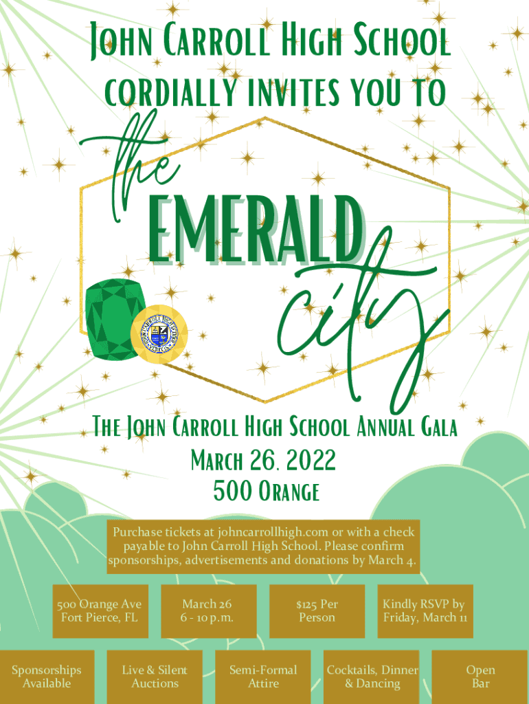 John Carroll High School cordially invites you tothEMERALD scythe John Carroll High School Annual Gala March 26, 2022 500 Orange Purchase tickets at johncarrollhigh.com or with a check payable to