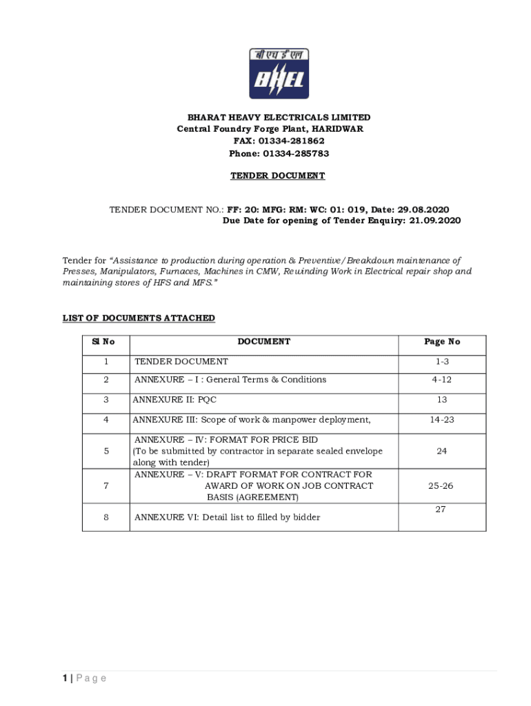 BHARAT HEAVY ELECTRICAL LIMITED Central Foundry Forge Plant, HARDWARE FAX: 01334281862 Phone: 01334285783 TENDER DOCUMENTTENDER DOCUMENT NO.: FF: 20: MFG: RM: WC: 01: 019, Date: 29.08.2020 Due Date