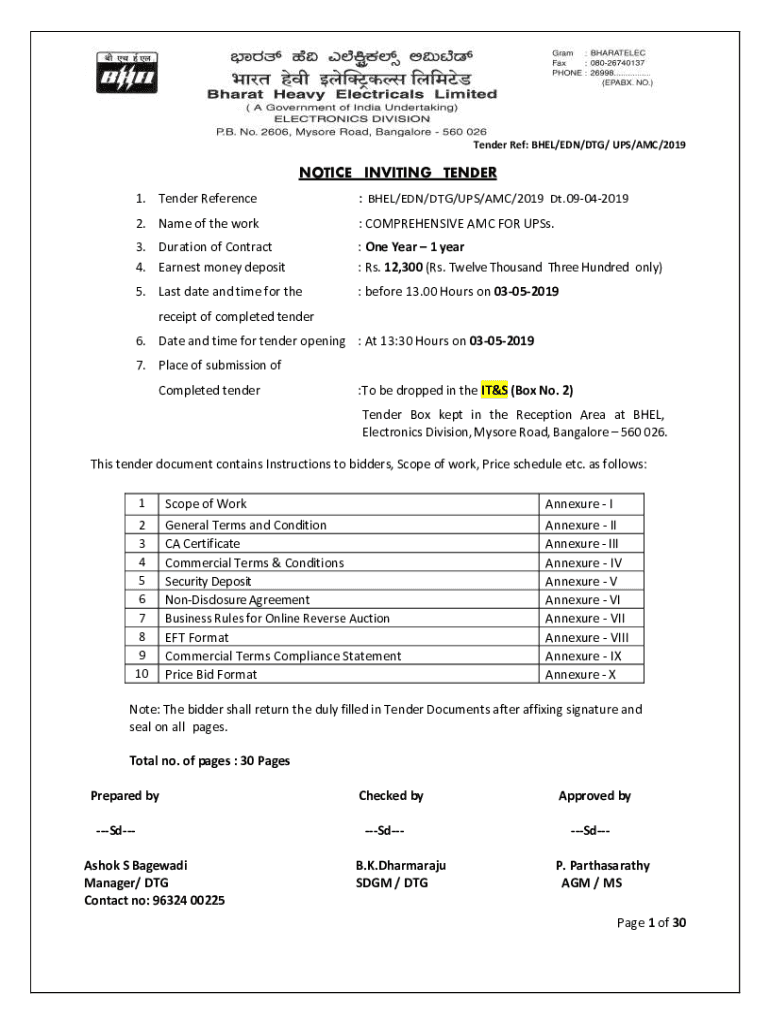 Tender Ref: BAEL/EDEN/DOG/ UPS/AMC/2019NOTICE INVITING TENDER 1. Tender Reference: BAEL/EDEN/DOG/UPS/AMC/2019 DT.090420192. Name of the work: COMPREHENSIVE AMC FOR UPS's.3. Duration of Contract 4.