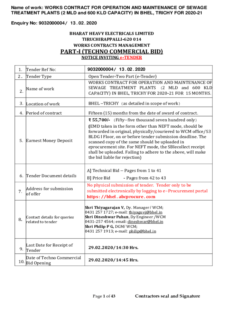 Name of work: WORKS CONTRACT FOR OPERATION AND MAINTENANCE OF SEWAGE TREATMENT PLANTS (2 MLD and 600 OLD CAPACITY) IN BAEL, TRICKY FOR 202021 Inquiry No: 9032000004/ 13.02.2020 BHARAT HEAVY ELECTRICAL