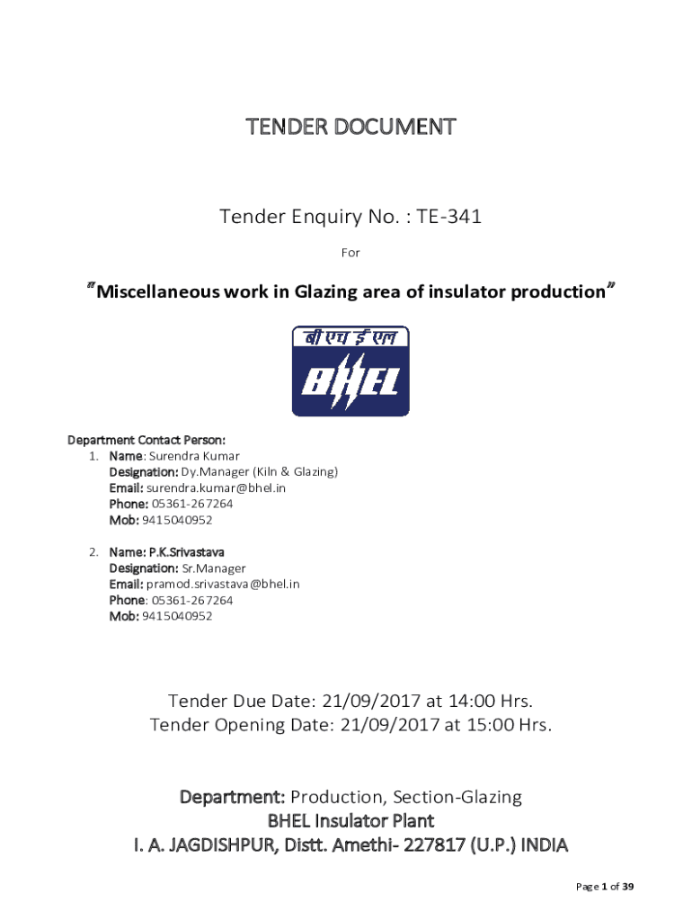 TENDER DOCUMENTTender Inquiry No. TE341 Miscellaneous work in Glazing area of insulator productionDepartment Contact Person: 1. Name: Narendra Kumar Designation: Dy. Manager (Kiln & Glazing) Email:
