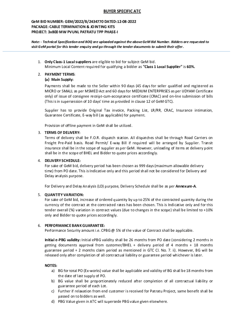 BUYER SPECIFIC ATC Gem BID NUMBER: GEM/2022/B/2434770 DATED:12082022 PACKAGE: CABLE TERMINATION & JOINTING KITS PROJECT: 3×800 MW PV UNL PART TPP PHASE Note: Technical Specification and BOX are uploaded