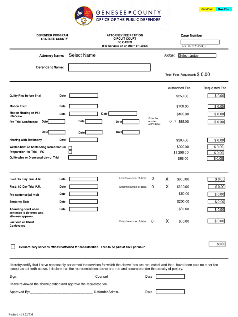 Save FormATTORNEY FEE PETITION CIRCUIT COURT FC CASESDEFENDER PROGRAM GENESES COUNTY Case Number:(For Services on or after 1012022)Attorney Name:Clear Form(ex. 18012345FC)Select Adjudge:Select JudgeDefendant
