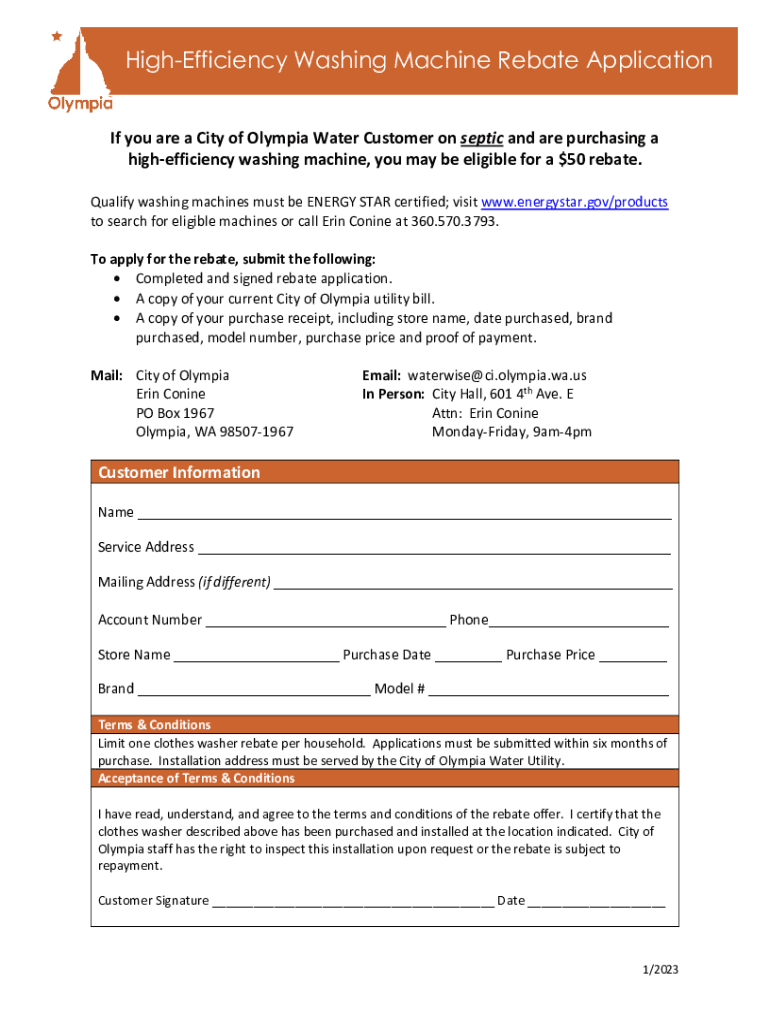 Inefficiency Washing Machine Rebate Application If you are a City of Olympia Water Customer on septic and are purchasing a high efficiency washing machine, you may be eligible for a $50 rebate. Qualify