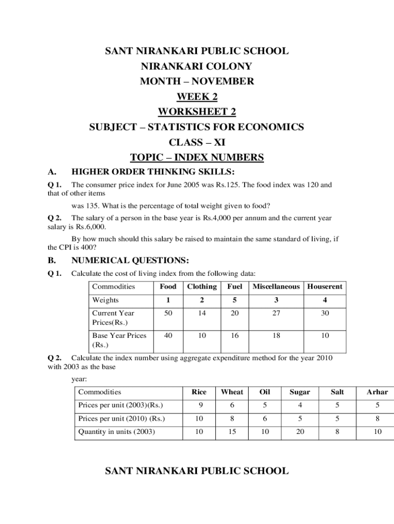 SENT NIRANKARI PUBLIC SCHOOL NIRANKARI COLONY MONTH NOVEMBER WEEK 2 WORKSHEET 2 SUBJECT STATISTICS FOR ECONOMICS CLASS XI TOPIC INDEX NUMBERS A.HIGHER ORDER THINKING SKILLS:Q 1. The consumer price