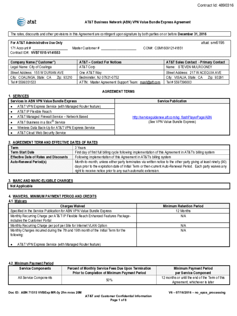 Contract I'd: 4890316AT&T Business Network (ABN) VPN Value Bundle Express Agreement The rates, discounts and other provisions in this Agreement are contingent upon signature by both parties on or