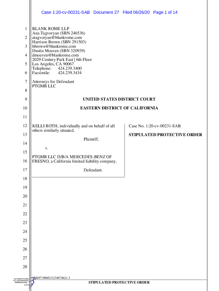 Case 1:20cv00231SAB Document 27 Filed 06/26/20-Page 1 of 141 2 3 4 5 6 7BLANK ROME LLP Ana Tagvoryan (SON 246536) atagvoryan@blankrome.com Harrison Brown (SON 291503) hbrown@blankrome.com Dustin Maven
