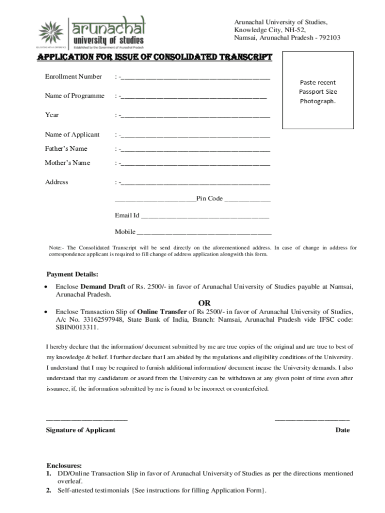 Anchal University of Studies, Knowledge City, NH52, NASA, Arunachal Pradesh 792103Application for issue of consolidated transcript Enrollment Number: ___Name of Program: ___Year: ___Name of Applicant: