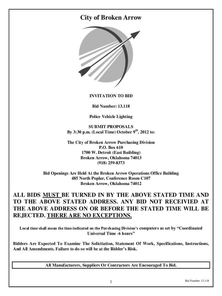 City of Broken ArrowINVITATION TO BID Number: 13.118 Police Vehicle Lighting SUBMIT PROPOSALS By 3:30 p.m. (Local Time) October 9th, 2012 to: The City of Broken Arrow Purchasing Division P.O. Box