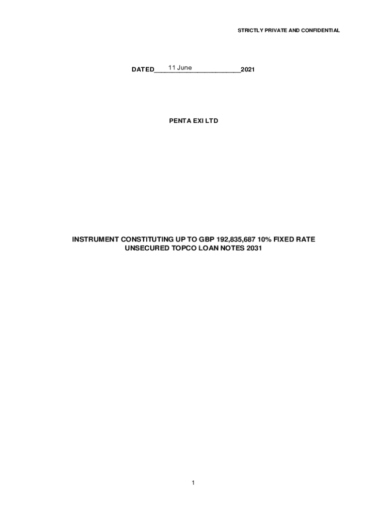 STRICTLY PRIVATE AND CONFIDENTIAL11 June DATED___2021PENTA EX INSTRUMENT CONSTITUTING UP TO GBP 192,835,687 10% FIXED RATE UNSECURED TOP CO LOAN NOTES 2031111 June THIS INSTRUMENT is made on ___2021