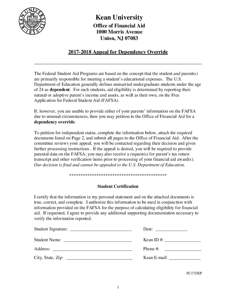 Get the free Online kean Appeal Form for Dependency Override