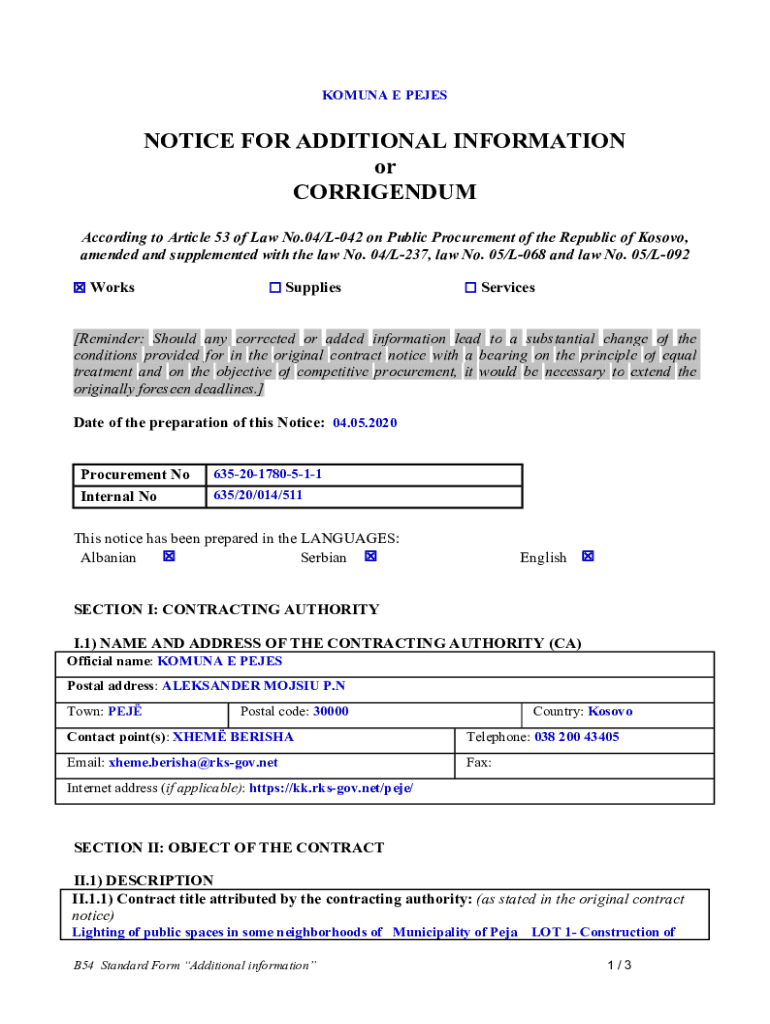 POMONA E PEJESNOTICE FOR ADDITIONAL INFORMATION or CORRIGENDUM According to Article 53 of Law No.04/L042 on Public Procurement of the Republic of Kosovo, amended and supplemented with the law No.