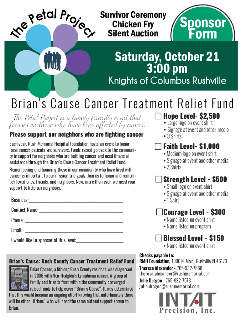 Survivor Ceremony Chicken Fry Silent Auctioned a P t role e Sponsor Form Saturday, October 21 3:00 knights of Columbus RushvilleBrians Cause Cancer Treatment Relief Fund The Petal Project is a family