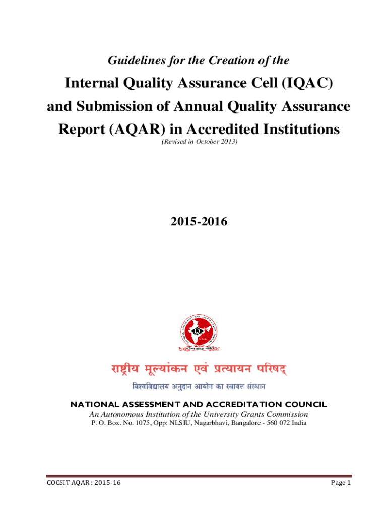 Guidelines for the Creation of internal Quality Assurance Cell (IAC) and Submission of Annual Quality Assurance Report (AGAR) in Accredited Institutions (Revised in October 2013)20152016NATIONAL ASSESSMENT