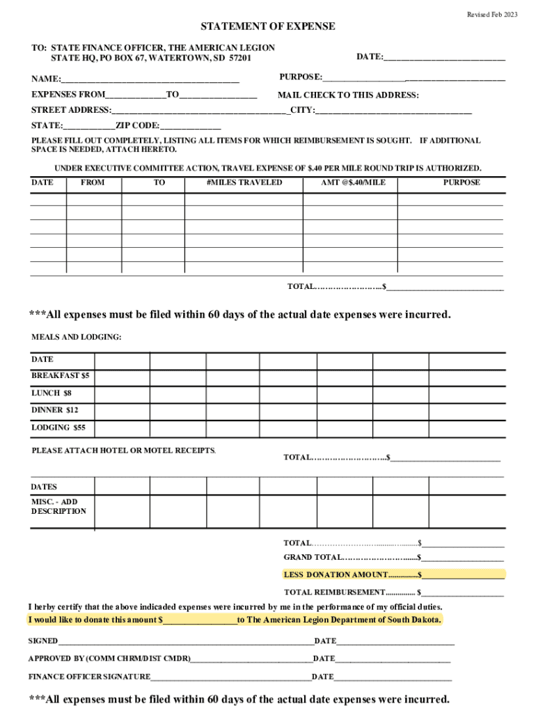 Revised Feb 2023STATEMENT OF EXPENSE TO: STATE FINANCE OFFICER, THE AMERICAN LEGION STATE HQ, PO BOX 67, WATERTOWN, SD 57201DATE:___NAME:___PURPOSE:___EXPENSES FROM___TO___MAIL CHECK TO THIS ADDRESS:STREET