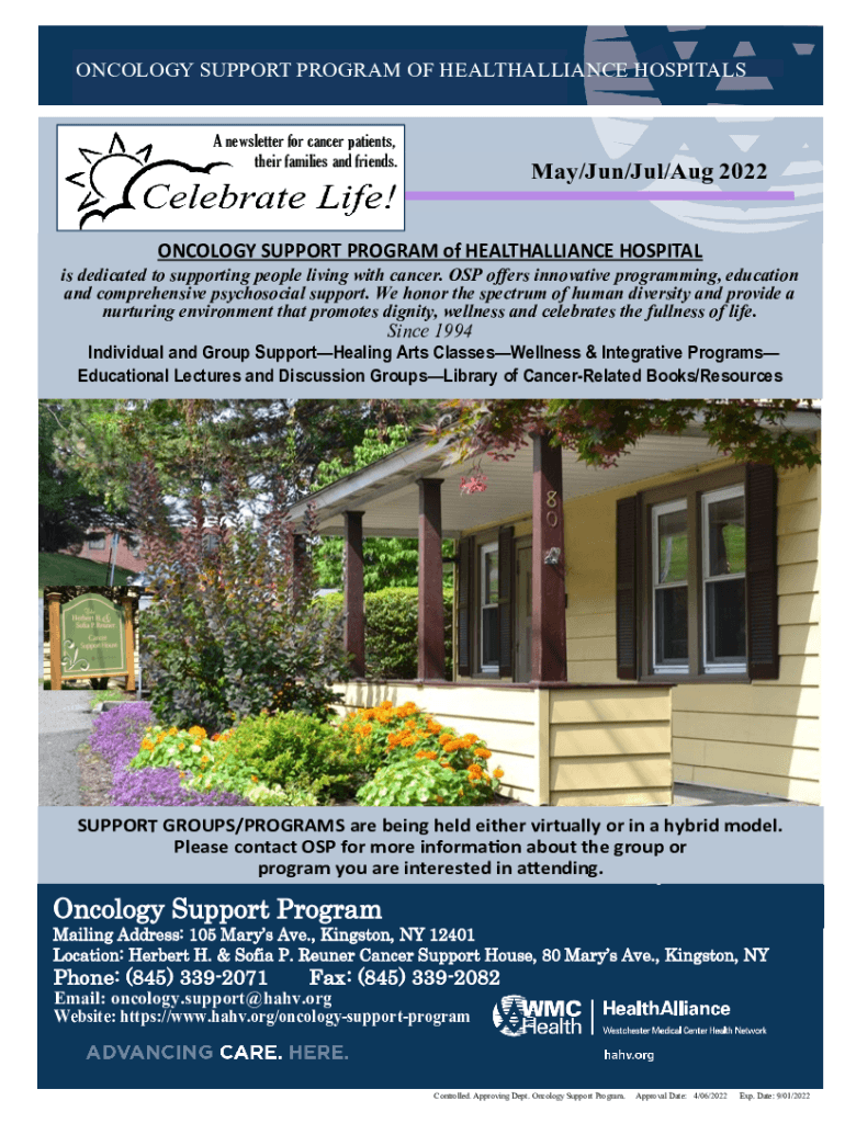 1ONCOLOGY SUPPORT PROGRAM OF HEALTHALLIANCE HOSPITALS Jun/Jul/Aug/Sept 2019 A newsletter for cancer patients, their families and friends. May/Jun/Jul/Aug 2022ONCOLOGY SUPPORT PROGRAM of HEALTHALLIANCE