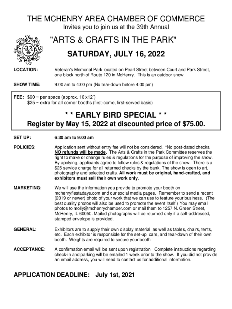THE McHenry AREA CHAMBER OF COMMERCE Invites you to join us at the 39th Annual\” ARTS & CRAFTS IN THE PARK\” SATURDAY, JULY 16, 2022, LOCATION:Veteran\'s Memorial Park located on Pearl Street
