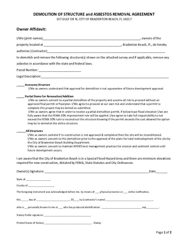 DEMOLITION OF STRUCTURE and ASBESTOS REMOVAL AGREEMENT 107 GULF DR N, CITY OF BRADENTON BEACH, FL 34217Owner Affidavit: I/We (print names)___, owners of the property located at ___, Bradenton Beach,