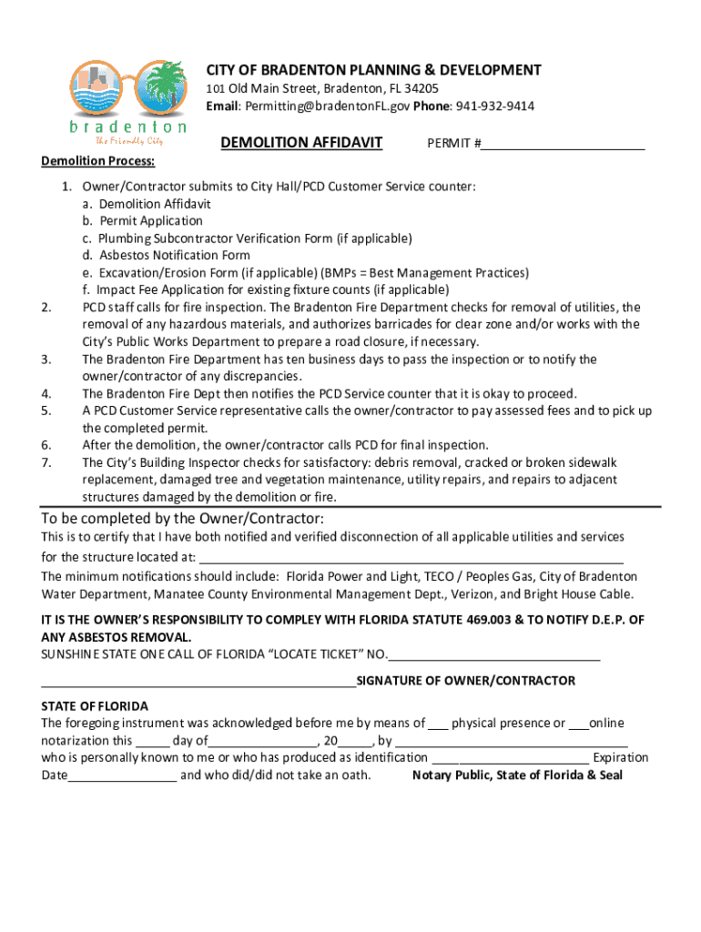 CITY OF BRADENTON PLANNING & DEVELOPMENT 101 Old Main Street, Bradenton, FL 34205Email: Permitting@bradentonFL.gov Phone: 9419329414Demolition Process:2. 3. 4. 5. 6. 7.DEMOLITION AFFIDAVITPERMIT #___1.
