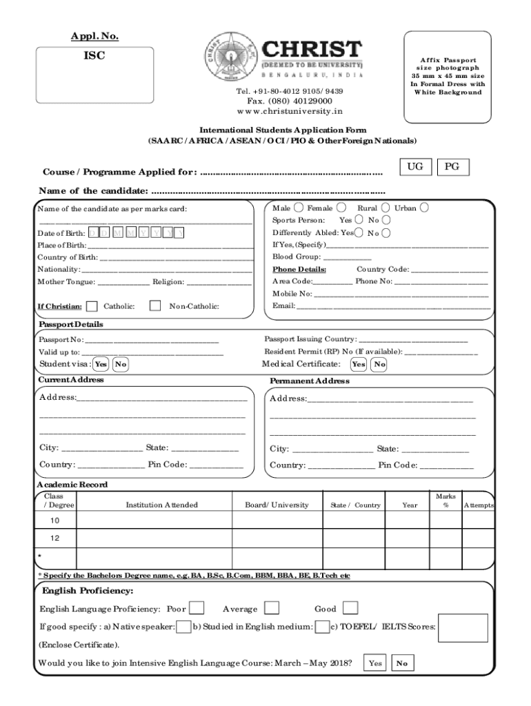 Apply. No.Suffix Pa s port s IZ e photo Ra pH 35 mm x 45 mm size In Formal Dress in White Backgrounder. +91804012 9105/9439Fax. (080) 40129000 www.christuniversity.in International Students Application