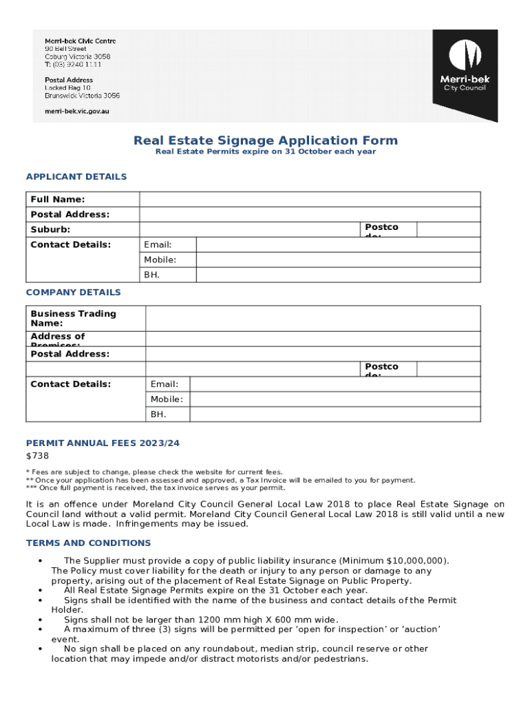 Template Real Estate Signage Permit application (DOC 42Kb) instructions