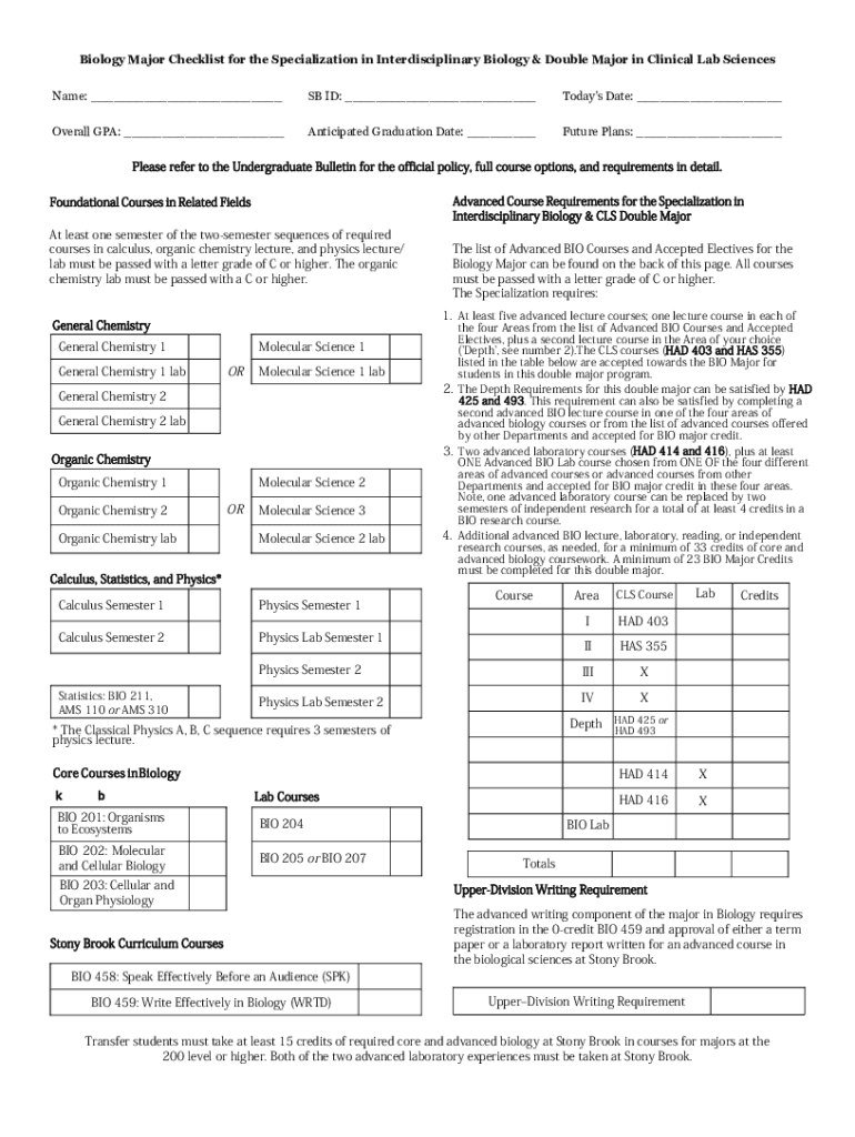 Biology Major Checklist for the Specialization in Interdisciplinary Biology & Double Major in Clinical Lab Sciences Name: ___SB ID: ___Today's Date: ___Overall GPA: ___Anticipated Graduation Date: