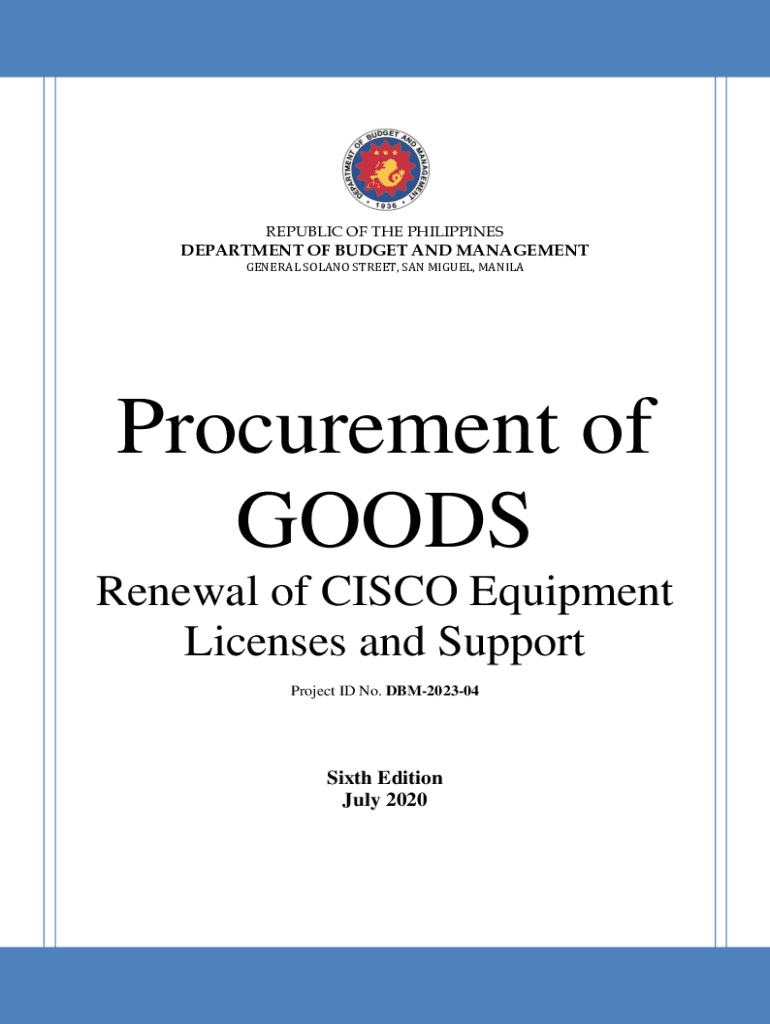 REPUBLIC OF THE PHILIPPINESDEPARTMENT OF BUDGET AND MANAGEMENT GENERAL SOLANO STREET, SAN MIGUEL, MANILAProcurement of GOODS Renewal of CISCO Equipment Licenses and Support Project ID No. DBM202304Sixth