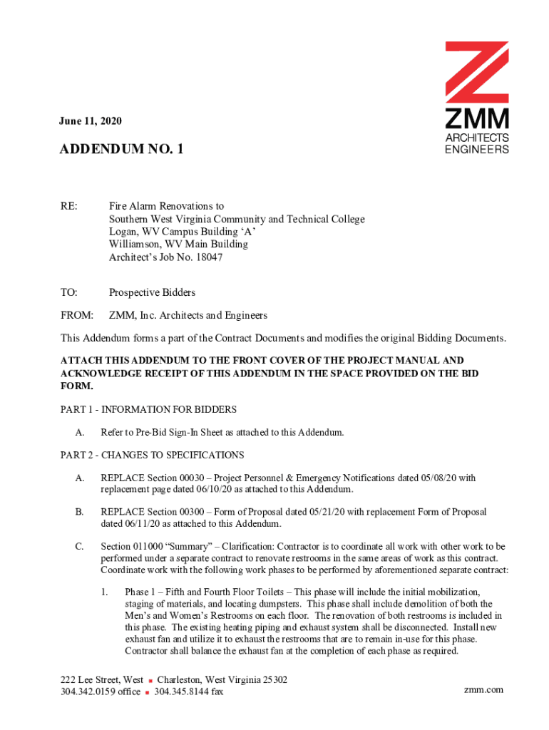 June 11, 2020ADDENDUM NO. 1RE:Fire Alarm Renovations to Southern West Virginia Community and Technical College Logan, WV Campus Building A Williamson, WV Main Building Architects Job No. 18047TO:Prospective