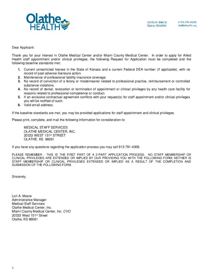 Dear Applicant: Thank you for your interest in Olathe Medical Center and/or Miami County Medical Center. In order to apply for Allied Health staff appointment and/or clinical privileges, the following