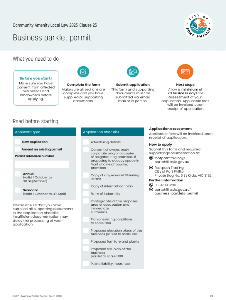 Community Amenity Local Law 2023, Clause 25Business park let permit What you need to do Before you start! Make sure you have consent from affected businesses and landowners before applying. Complete