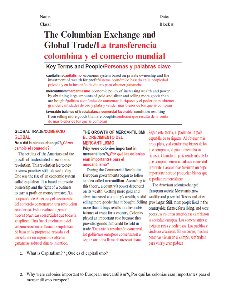 Name:Date:Class:Block #:1. What is Capitalism? / Ques El capitalism?2. Why were colonies important to European mercantilism?/POR EU leis colonias era import antes para mercantilism Europe? Hombre: