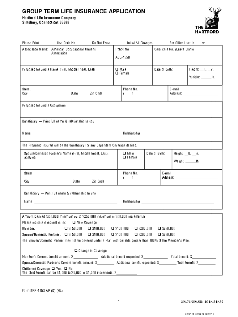 GROUP TERM LIFE INSURANCE APPLICATION Hartford Life Insurance Company Sims bury, Connecticut 06089Please Print. Use Dark Ink. Do Not Erase. Initial All Changes. Association Name: American Occupational
