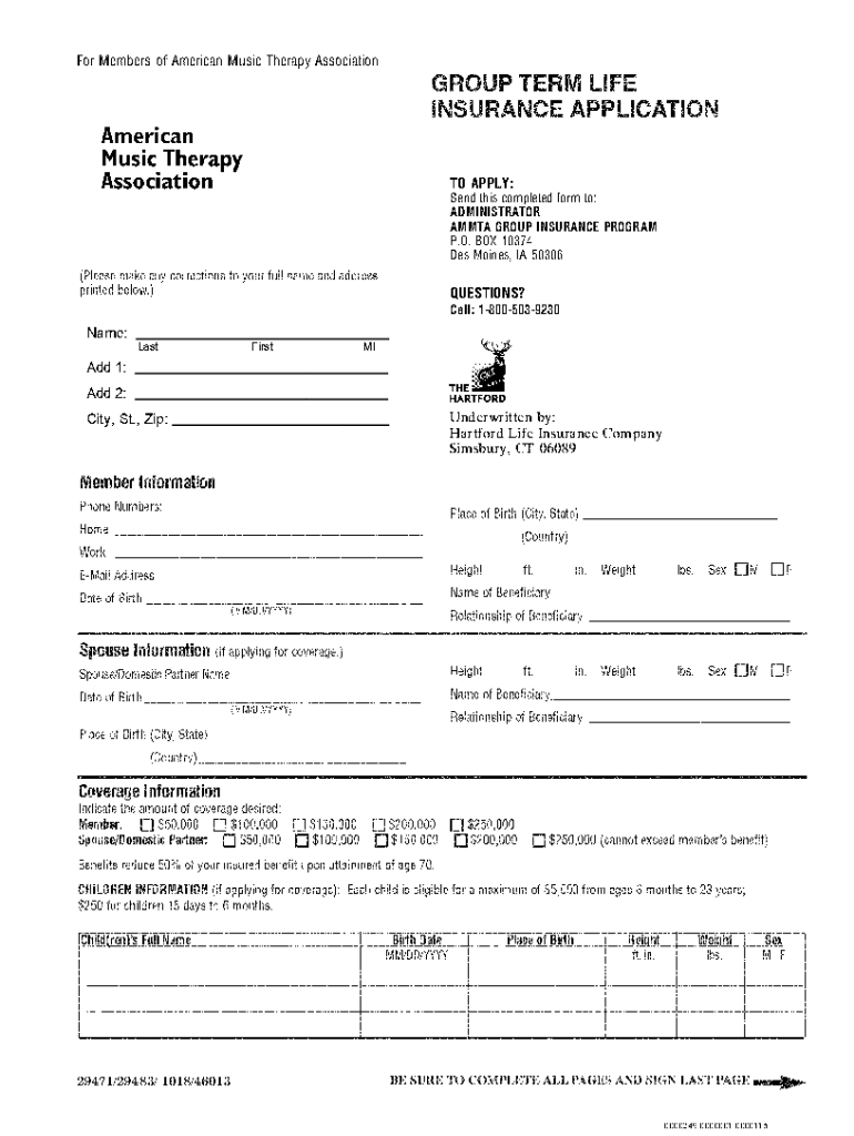 Moore_ammta29471termlifeinsuranceFor Members of American Music Therapy Association TO APPLY:Send this completed form to: ADMINISTRATOR AM MTA GROUP INSURANCE PROGRAM P.O. BOX 10374 Des Moines, IA