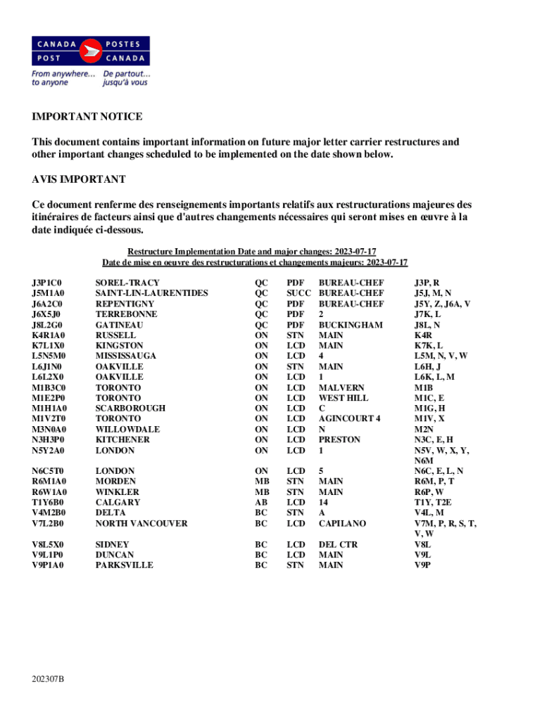 IMPORTANT NOTICE This document contains important information on future major letter carrier restructures and other important changes scheduled to be implemented on the date shown below. AVIS IMPORTANT
