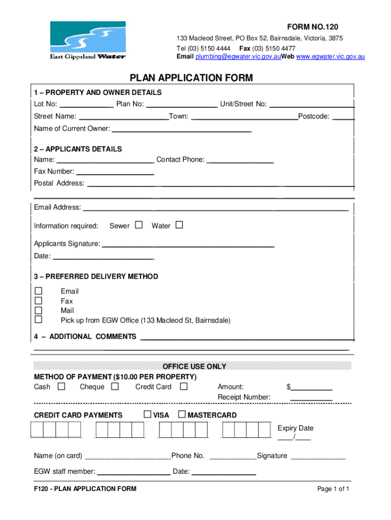 FORM NO.120 133 MacLeod Street, PO Box 52, Bairns dale, Victoria, 3875 Tel (03) 5150 4444 Fax (03) 5150 4477 Email plumbing@egwater.vic.gov.auWeb www.egwater.vic.gov.auPLAN APPLICATION FORM 1 PROPERTY