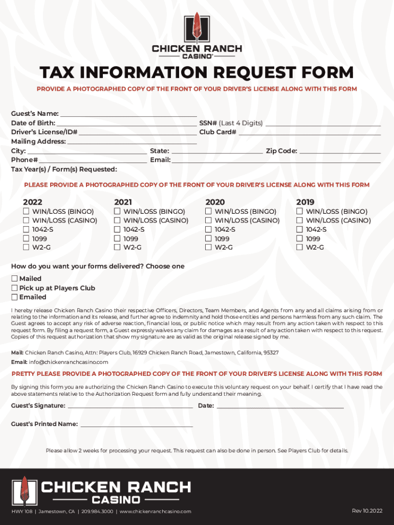 TAX INFORMATION REQUEST FORM PROVIDE A PHOTOGRAPHED COPY OF THE FRONT OF YOUR Driver's LICENSE ALONG WITH These Forests Name: Date of Birth: Driver's License/ID# Mailing Address: City: Phone# Tax
