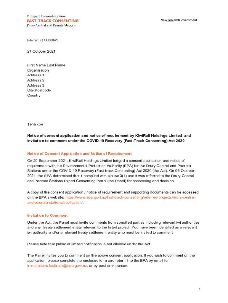 File ref: FTC00004127 October 2021 First Name Last Name Organization Address 1 Address 2 Address 3 City Postcode Country Joe Notice of consent application and notice of requirement by Kiwifruit Holdings