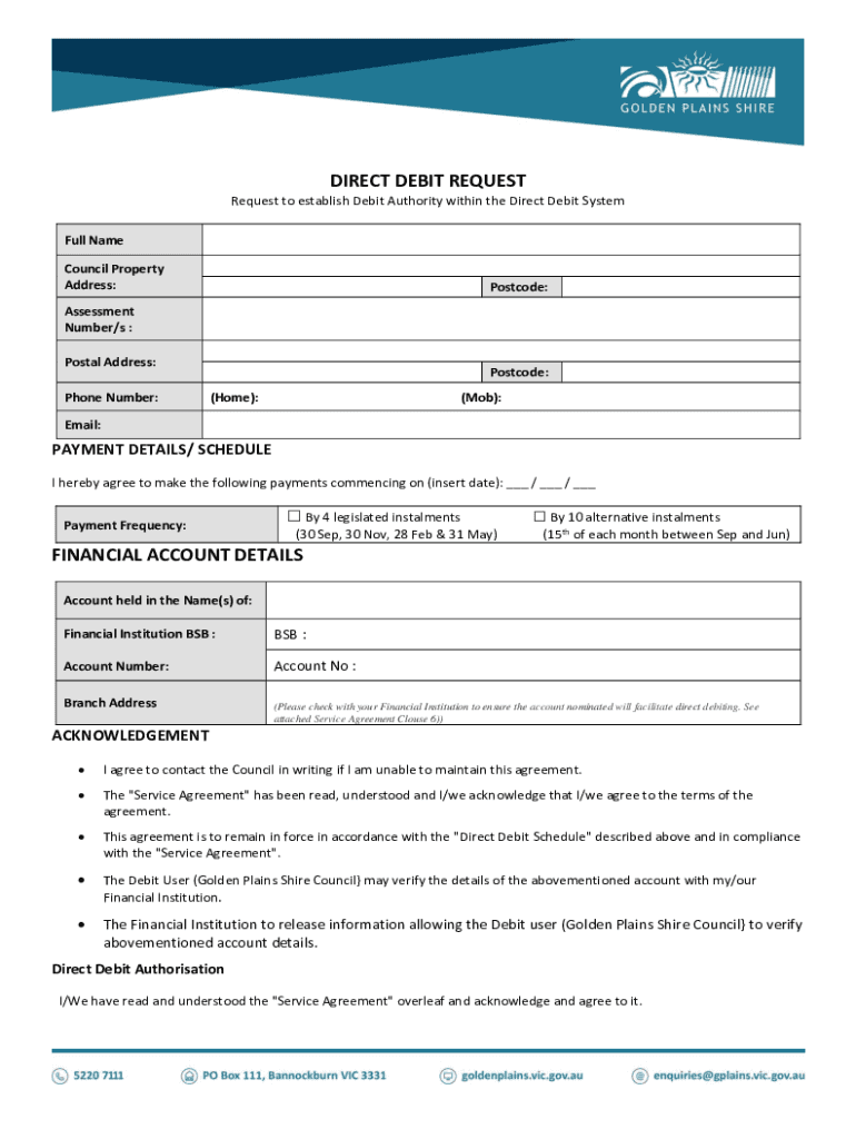 DIRECT DEBIT REQUEST to establish Debit Authority within the Direct Debit System Full Name Council Property Address:Postcode:Assessment Number/s : Postal Address: Phone Number:Postcode: (Home):(Mob):Email:PAYMENT