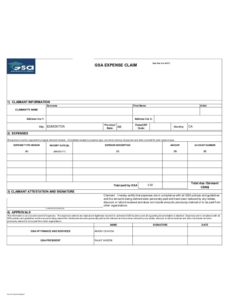 Date Rec\'d in ACCT:GSA EXPENSE CLAIM1) CLAIMANT INFORMATION SurnameFirst NameInitialCLAIMANT\'S Headdress line 2:Address line 1: City:EDMONTONProvince/ State:Postal/ZIP Code:Country:CA2) EXPENSES